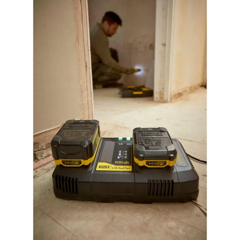 Pikalaturi, joka on osa 18 V STANLEY FatMax V20 -järjestelmää. Laturilla voi ladata kaksi akkua, ja siinä on USB-liitäntä puhelimen tai tabletin lataamiseen.