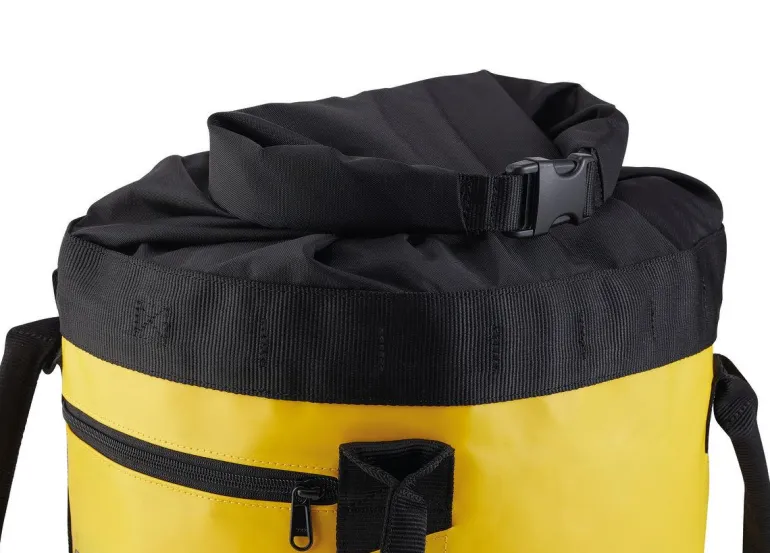 Petzlin köysilaukku, joka on valmistettu kestävästä TPU-materiaalista. Pyöreä muotoilu – pysyy pystyssä ja pitää muotonsa myös tyhjänä. Muotoilu mahdollistaa helpon pääsyn laukun sisältöön. Laukussa on tilaa jopa 110 metrille köyttä (halkaisijaltaan 11 mm). Pehmustetut olkahihnat mukavuuden takaamiseksi, ulkotasku henkilökohtaisten tavaroiden säilyttämiseen ja paikka merkinnöille sisällön nopeaa tunnistamista varten.
