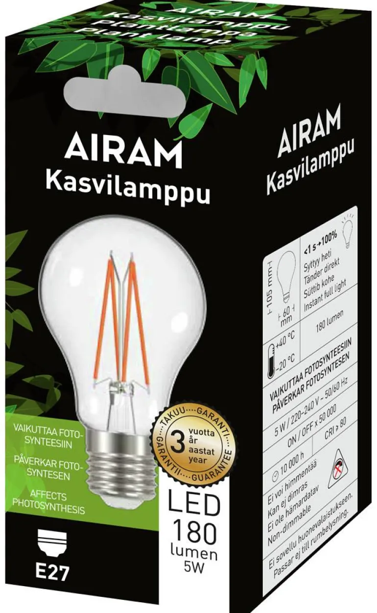 LED-lamppu (kasvilamppu) klassisella muotoilulla, erityisesti suunniteltu kasveja varten. Kasvit hyödyntävät valoa eri tavalla kuin ihmiset. Kasvilampussa on huomioitu kasvien tarvitsemat valon ominaisuudet – valontarpeessa tärkeintä ovat punaisen ja sinisen valon alueet, jotka korostuvat kasvilampussa. Näitä korostamalla kasvit sekä voimistuvat että saavuttavat hyvin pituutta.