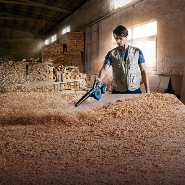 Bosch GBL 18V-120 Professional on 18 V:n puhallin/lehtipuhallin, jossa säädettävä ilmavirtaus ja tehokas suorituskyky 75 m/s:n ilmanpuhalluksella.