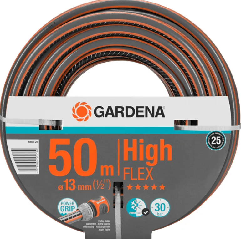 GARDENA Comfort HighFLEX on 50 m pitkä letku, jonka halkaisija on 13 mm (1/2″). Power Grip -profiili takaa täydellisen liitännän letkun ja letkunliittimen välille. Uuden teknologian ansiosta ne lukittuvat toisiinsa hammastettujen pyörien tavoin. Power Grip -profiili mahdollistaa sen, mitä monet puutarhurit ovat jo pitkään toivoneet: luotettavan ja täydellisesti pitävän liitännän. Kohotetun profiilin positiivinen sivuvaikutus: Letku on helpompi kelata ja liukuu hyvin. Letku kestää painetta ja säilyttää muotonsa laadukkaan spiraalimaisen verkkokankaan ansiosta, jossa kaksi spiraalia vaikuttaa vastakkaisiin suuntiin, mutta on silti käytössä joustavampi kuin Comfort FLEX -letku. Tämä johtuu spiraalien suuremmasta tiheydestä, mikä tekee letkusta joustavamman ja helpottaa sen käsittelyä.