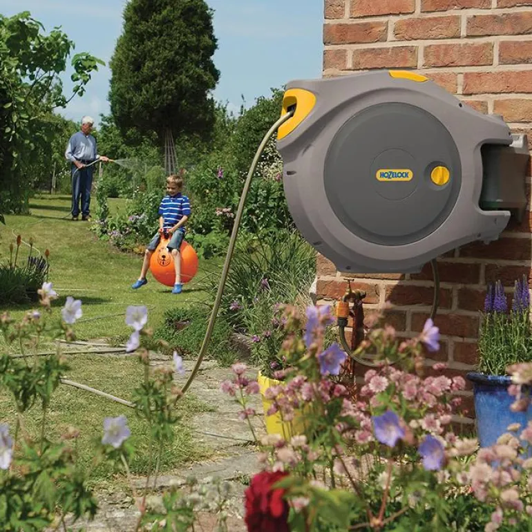 Tämän letkukelan avulla vedät letkun helposti ja sujuvasti. Kelan lukitusmekanismi lukiutuu automaattisesti niin, että letkua ei tarvitse pitää tiukasti kiinni. Jos tarvitset lisää pituutta, vedä letkua kevyesti, jotta salpa avautuu, jotta voit edetä ja kastella muita puutarhan osia.