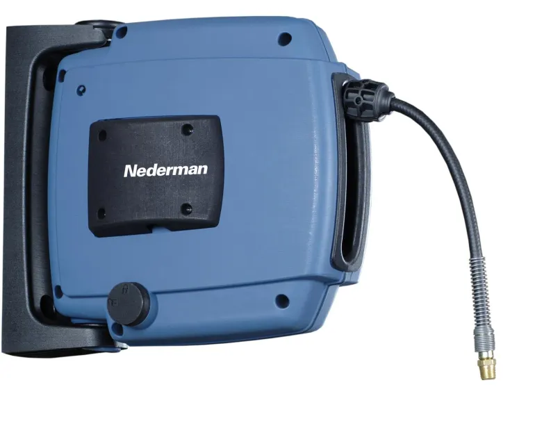 Valmistettu iskunkestävästä komposiittimateriaalista. Kääntyvä pikakiinnike seinää ja kattoa varten. Optimoitu ulostulo helpottaa letkun reititystä kaikissa kulmissa. Letkun pää puristetulla nipalla ja murtumattomalla teräskelalla. Rumpu, jossa on kuulalaakerit molemmin puolin. Toimitetaan 1 metrin liitäntäletkulla, halkaisija 10 mm (3/8¨).