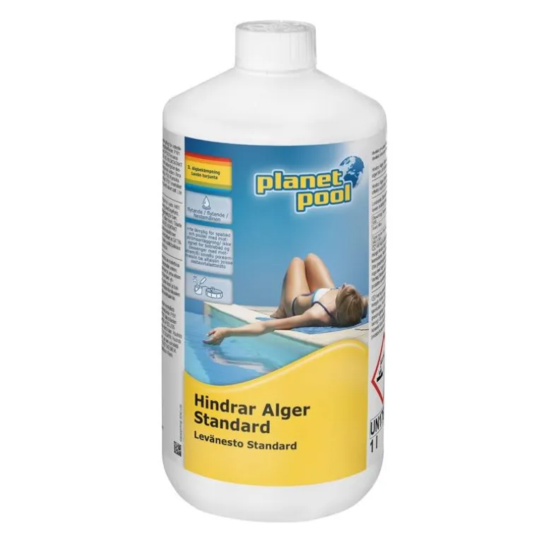 Planet Pool Levänesto Standard on leväntorjunta-aine, joka estää levien muodostumista. Tämä tuote on tehokas leväntorjunta-aine, joka on nestemäisessä muodossa ja sekoitetaan vesiämpäriin ennen altaaseen kaatamista. Leväntorjunta-aineita käytetään aina ennaltaehkäisevänä toimenpiteenä. Klooriton, heikosti vaahtoava. Levät muodostavat kasvualustan bakteereille ja siksi allas on pidettävä puhtaana levistä. Pinnan liukkaus voi olla ensimmäinen merkki levistä altaassasi. Käytä biosideja turvallisesti. Lue aina etiketti ja tuotetiedot ennen käyttöä.