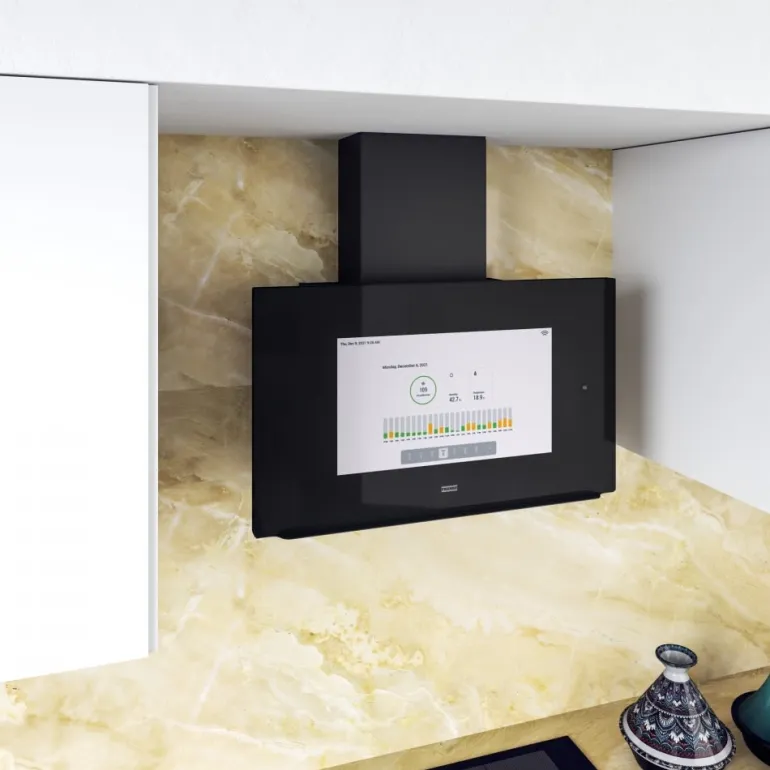 Franke AQ Sense on liesituuletin innovatiivisilla toiminnoilla ja 21,5″ kosketusnäytöllä. Sen avulla voit helposti selata internetiä, katsoa videoita ja kuunnella musiikkia sisäänrakennettujen kaiuttimien kautta. Liesituuletinta voi ohjata kolmella tavalla: äänikomennoilla, mobiilisovelluksella tai kosketusnäytön kautta. AQ Sense -liesituuletin on lisäksi varustettu sensorilla, joka mittaa ja reagoi keittiön ilmanlaatuun. Liesituuletin tarkkailee myös ilman lämpötilaa ja kosteutta raikkaan keittiön ja miellyttävän ympäristön varmistamiseksi.