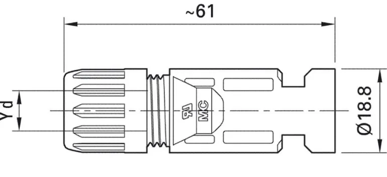 Liitin (uros) aurinkosähköasennuksiin. Sopii kaapeleille, joiden halkaisija on 5,9–8,8 mm.