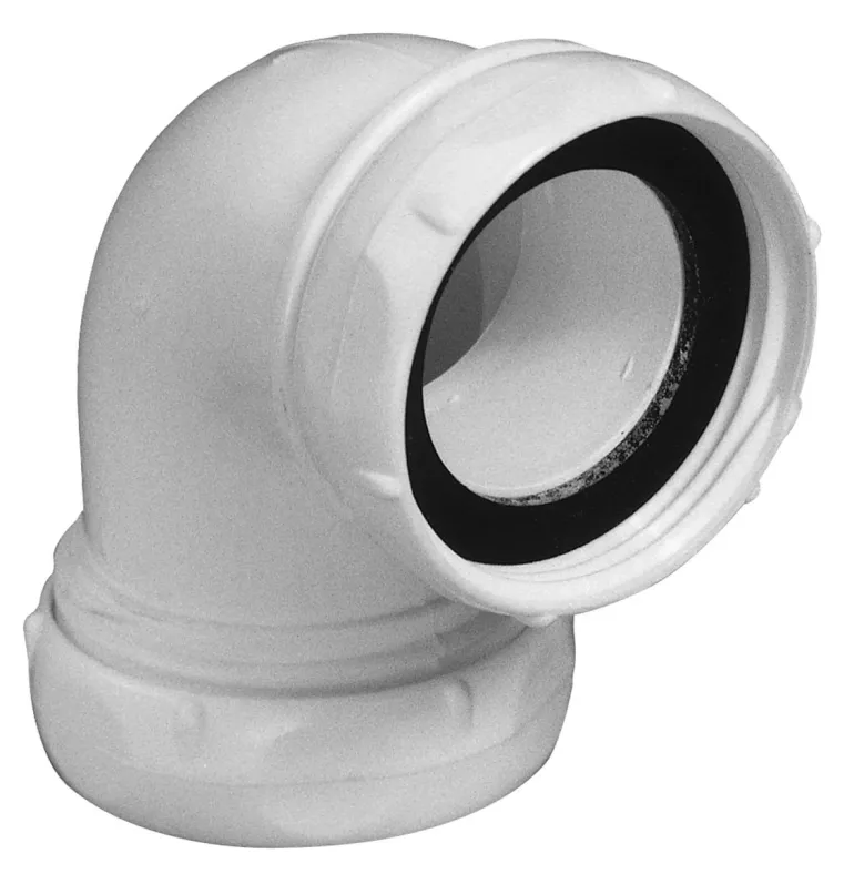 Liitin, jossa on sisäkierre G40 ja liukumutteri. Liittimen kulma on 90°, tarkoitettu sisätilojen viemäriputkiin.