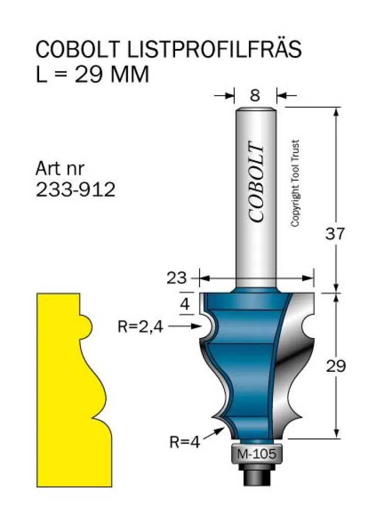 Listajyrsin pohja-asennetulla ohjainlaakerilla. Leikkuukorkeus 29 mm ja jyrsintäsyvyys 6.5 mm. D=23 TL=76 S=8.