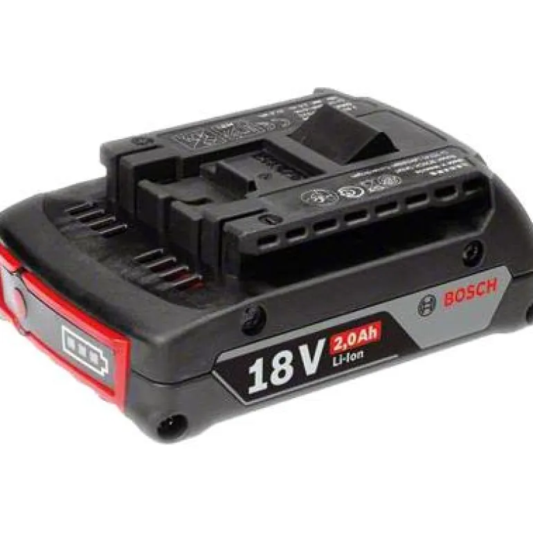 Bosch 18V:n, 2,0 Ah:n Li-Ion-akku. Sopii kaikkiin 18 V:n vakio- ja suuren tehon tuotteisiin.