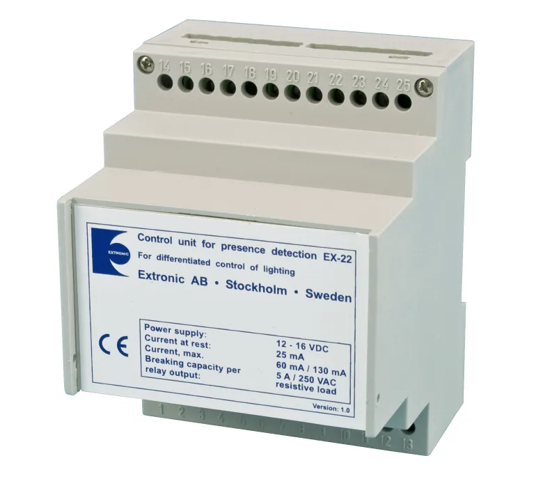 EX-22 on logiikkamoduuli kahden valaistusryhmän ohjaamiseen yhdessä tilassa tai kahdessa tilassa, joissa kummassakin on yksi valaistusryhmä. Valaistusryhmässä A on digitaalinen valonsäätö, josta vastaa kytketty valokenno Vaihtoehtoisesti voidaan kytkeä kaksi valokennoa, jotka mahdollistavat erillisen automaattisen valonohjauksen kahdella digitaalisella kanavalla. Valaisimia ohjataan digitaalisesti DSI-standardin mukaisesti. Kahdella DSI-kanavalla ohjataan kahta erillistä valaisinryhmää väyläkaapelien kautta. Näin voidaan paremmin kompensoida ikkunoista tai kattoikkunoista tulevaa ulkovaloa ja säästää energiaa. Valaistusryhmät A ja B sytytetään kytketyillä painikkeilla. Sammutus tapahtuu automaattisesti läsnäolotunnistimen ollessa kytkettynä, kun läsnäolo lakkaa, tai painikkeen avulla. Kirkkautta voidaan säätää myös manuaalisesti pitämällä kanavan A tai B painiketta painettuna. EX-22:ssa on kaksi tuloa läsnäolotunnistimille.
