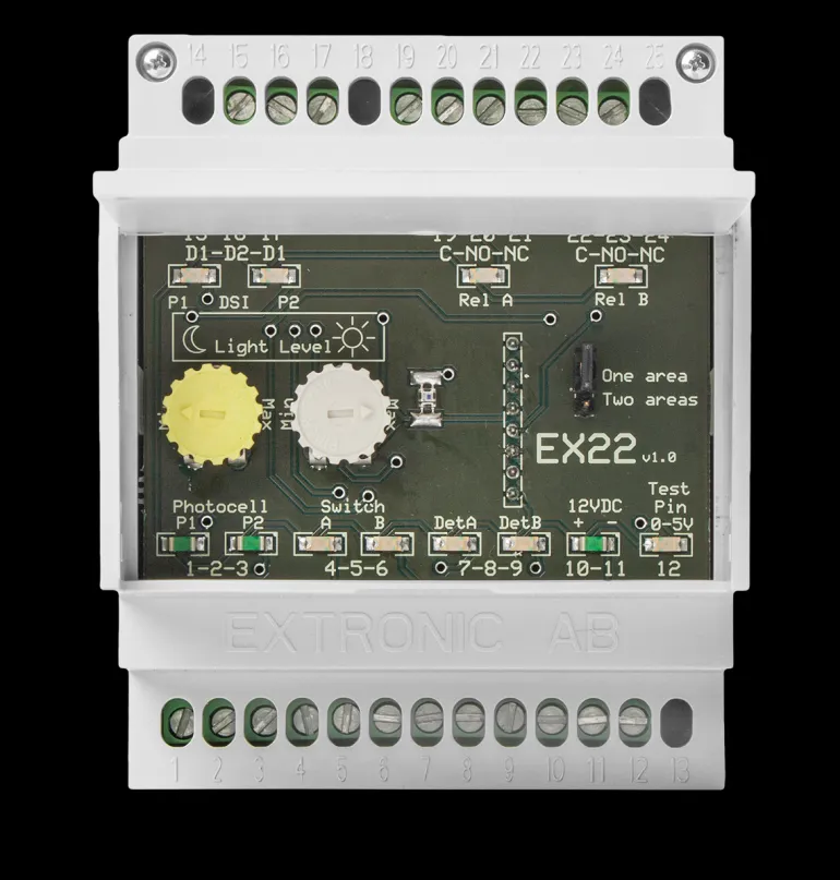 EX-22 on logiikkamoduuli kahden valaistusryhmän ohjaamiseen yhdessä tilassa tai kahdessa tilassa, joissa kummassakin on yksi valaistusryhmä. Valaistusryhmässä A on digitaalinen valonsäätö, josta vastaa kytketty valokenno
