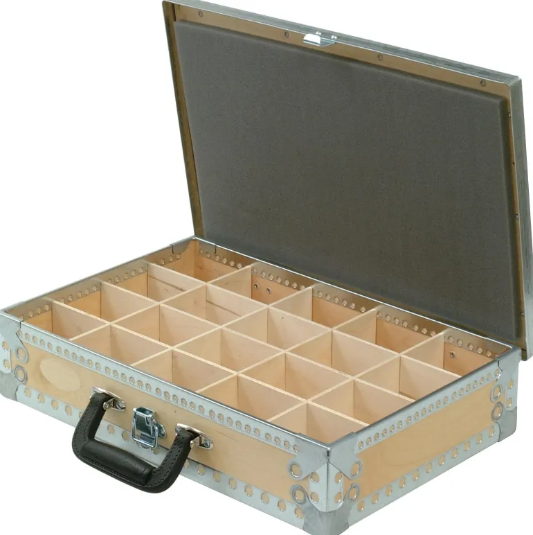 Säilytyslaatikko 20 lokerolla. Kannen sisäpuolella on vaahtomuovipehmuste. Valmistettu 4 mm:n koivuvanerista. Kaikissa kulmissa ja yläreunassa on galvanoidut peltivahvikkeet. Kannessa on galvanoitu kulmaprofiilikehys. Kantokahva ja lukitus etuosassa. Pintakäsitelty UV-valon kestävällä maalilla, joka takaa parhaan mahdollisen suojan kosteudelta ja kulumiselta. Paino 2,8 kg.