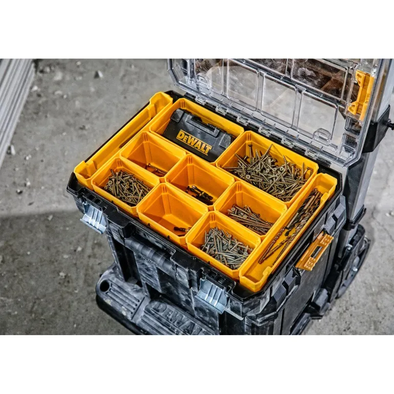 Lokerikko/säilytyslaatikko pienille osille ja lisävarusteille. Tilavuus 7,8 l. IP54-luokiteltu rakenne, joka suojaa vedeltä ja pölyltä ja pitää sisällön kuivana ja turvassa. Lähes tuhoutumaton läpinäkyvä polykarbonaattikansi, jonka kautta näkee sisällön helposti. Kestävä ergonominen kahva helppoa ja mukavaa kantamista varten. Ruostumattomasta teräksestä valmistetut metallisalvat takaavat laatikon kestävyyden ja pidemmän käyttöiän. Sivusalvat mahdollistavat laatikon yhdistämisen muiden TSTAK-moduulien kanssa. 2 isoa, 6 keskikokoista ja 2 pitkää lokeroa.