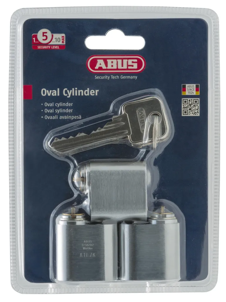 ABUS soikea lukkosylinteri (yhteislukitus). 7-nastainen tarkkuusylinteri, jossa on poraussuoja ja kaksi karkaistua terästappia lukkopesässä. 3-pakkaus kolmella avaimella.
