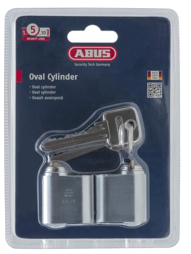 ABUS soikea lukkosylinteri (yhteislukitus). 7-nastainen tarkkuusylinteri, jossa on poraussuoja ja kaksi karkaistua terästappia lukkopesässä. 2-pakkaus kolmella avaimella.