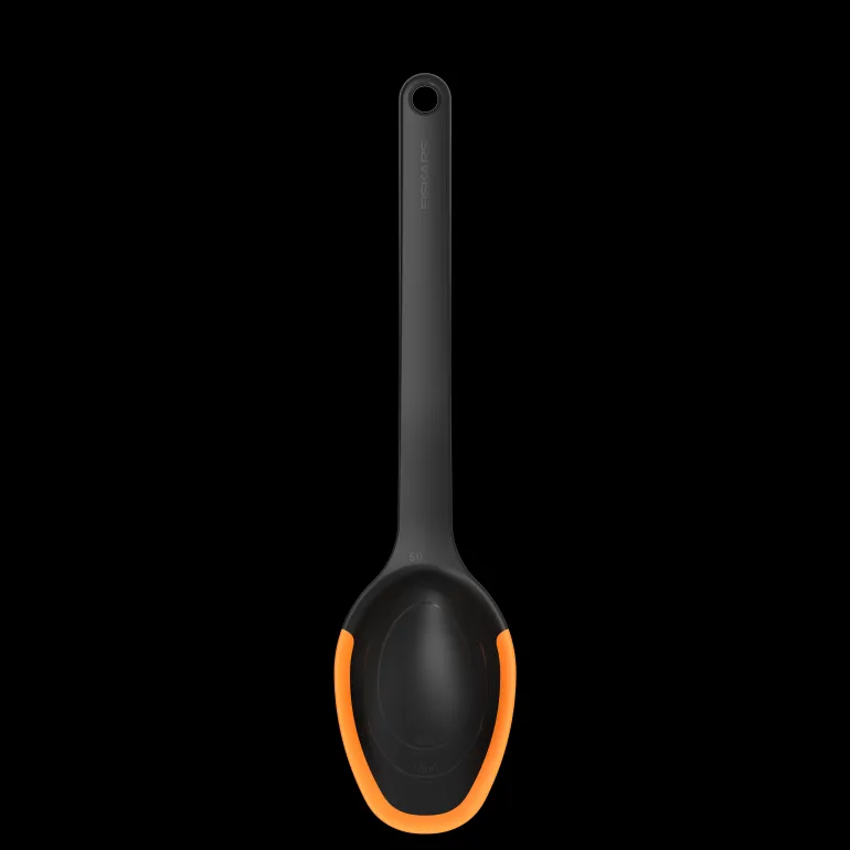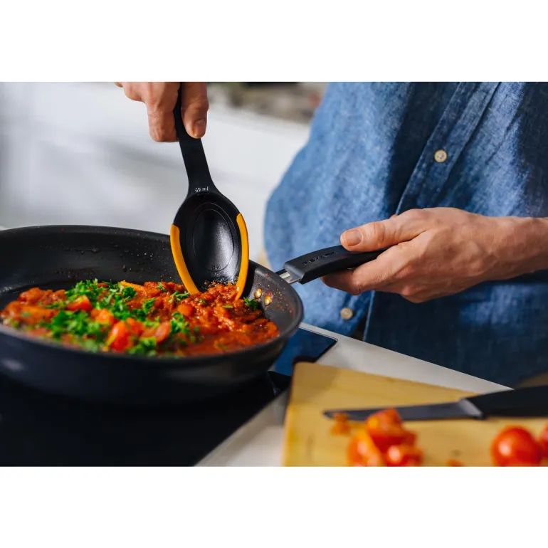 Fiksu ja kätevä kauha, jossa joustavat silikonireunat. Helppo kaapia kaikki pois pannulta vahingoittamatta pinnoitetta. Integroitu mitta-asteikko teelusikalle, ruokalusikalle ja 0,5 dl. Konepesun kestävät.