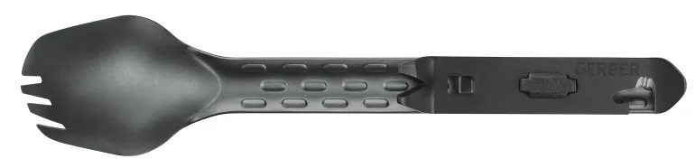 2-in-1-työkalu, jossa haarukka- ja lusikkatoiminto. Työkalussa on suuri lusikkapinta ja pitkät haarukan piikit.