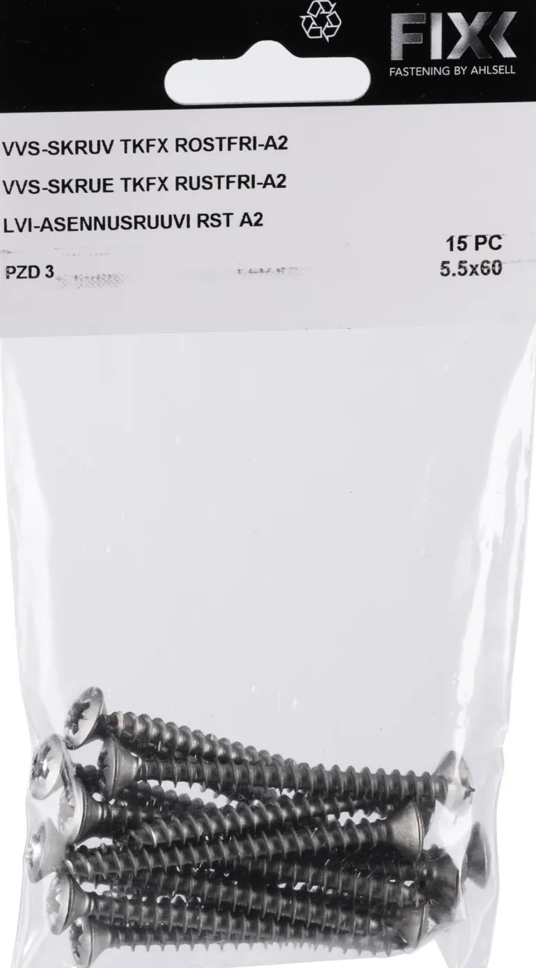 LVI-ruuvi, jossa on kupera upotettu pää (pozidrive Z) siistiä asennusta varten. Soveltuu wc-istuinten, pesualtaiden ja muiden kylpyhuoneen kalusteiden asennukseen. Asennukseen puuhun tai tulpalla.