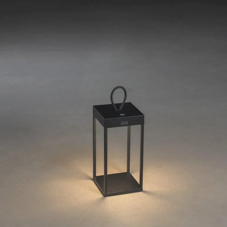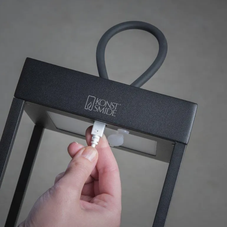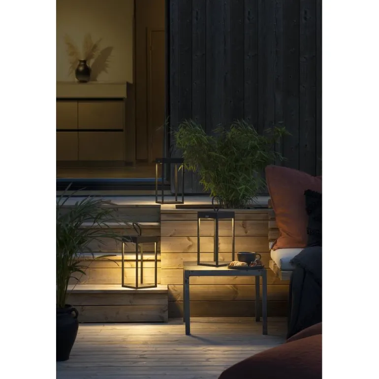 Tyylikäs koristevalaisin puukannelle tai patiolle mustalakattua alumiinia. Lyhty on 50 cm korkea, ladataan USB:n kautta ja voidaan himmentää haluttuun asteeseen sekä asettaa haluttuun asentoon.