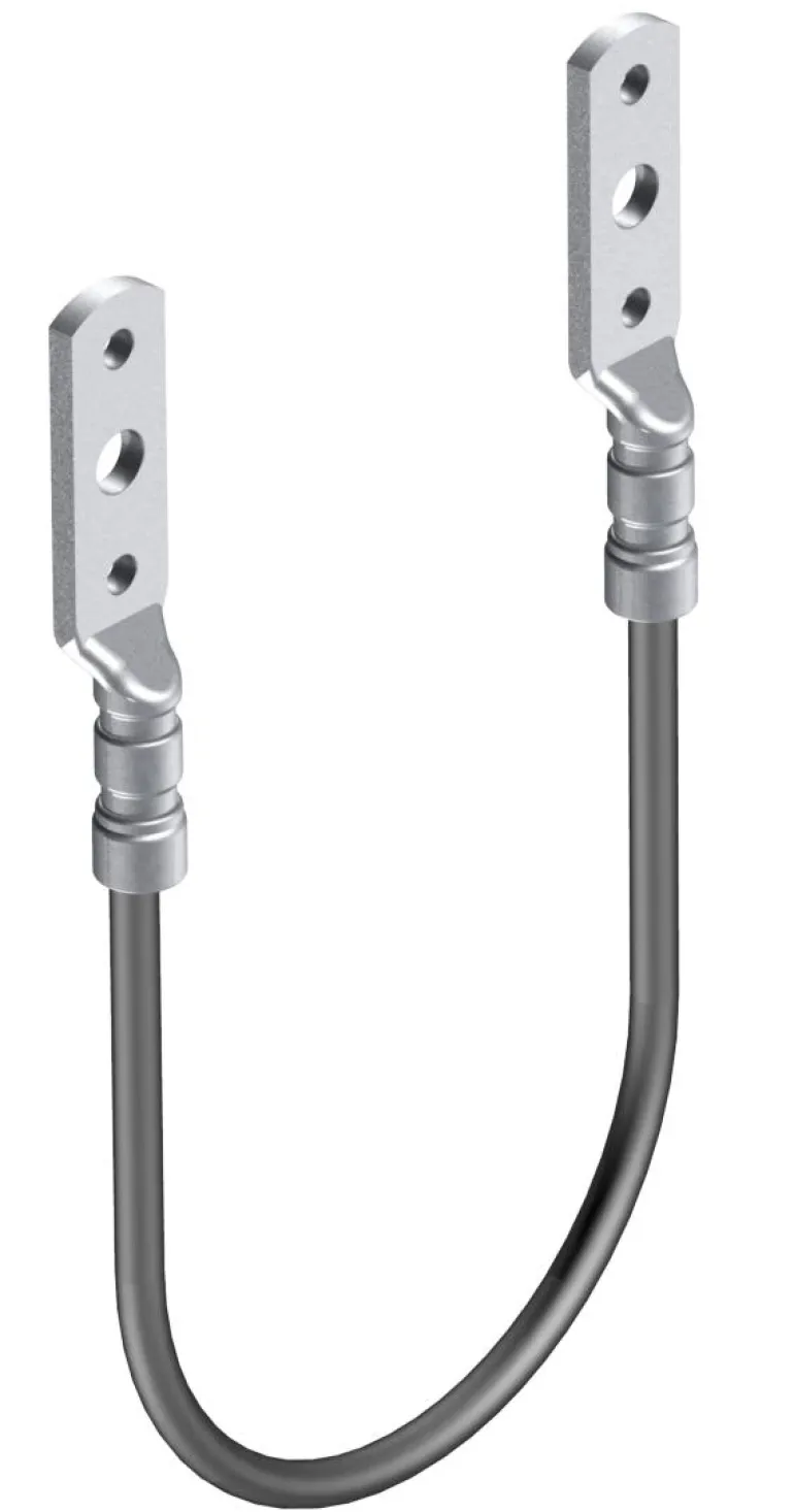 Taipuisa liitäntäkaapeli 16 mm, monilankaiset kuparijohtimet ja kumieriste, puristetut alumiiniset kaapelikengät. Pituus 300 mm ja asennusreiät 1×10 mm ja 2×4,3 mm. Liikkuvien osien liittämiseen.