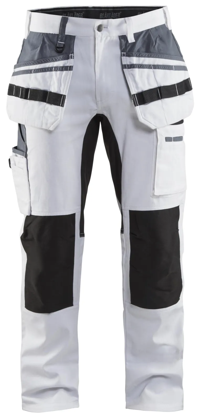 Modernit ja mukavat maalarinhousut, joissa on työkalutaskut, ulkopuoliset polvitaskut ja liikkuvutta ja mukavuutta lisäävät joustavat kaitaleet huolellisesti valituissa paikoissa, kuten haaroissa, polvissa, takamuksessa ja pohkeissa. Puuvillan suuri osuus tarkoittaa, että kankaalla on hyvä kosteuden imukyky.
