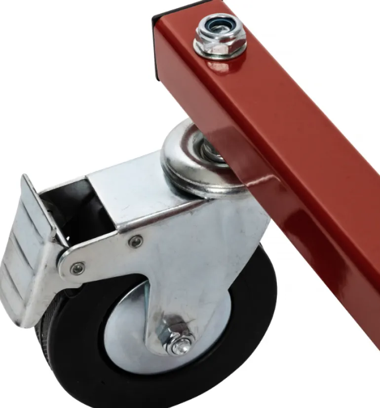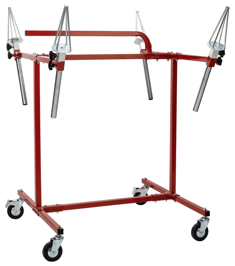 PELA 506568 on maalausteline 4 säädettävällä varrella, joissa on kartiomainen yläosa vanteiden ripustamista varten. Teline on varustettu 4 pyörällä, joista 2 lukittavia ja kahvalla siirtämistä varten. Mitat: 950×1130,5×1260 mm.