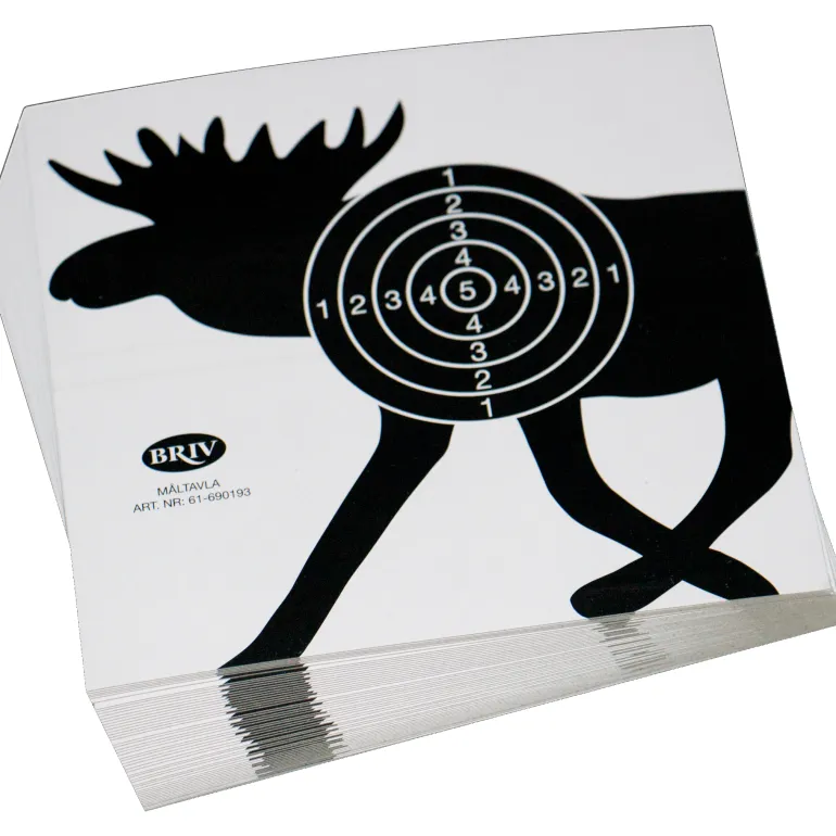 Paperista valmistettu maalitaulu hirven kuvalla. Ilmakivääriammuntaan 10-renkaisella muotoilulla.