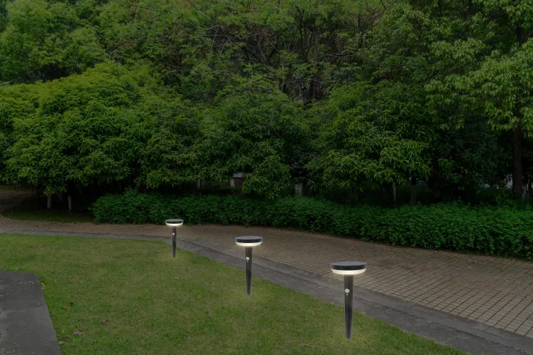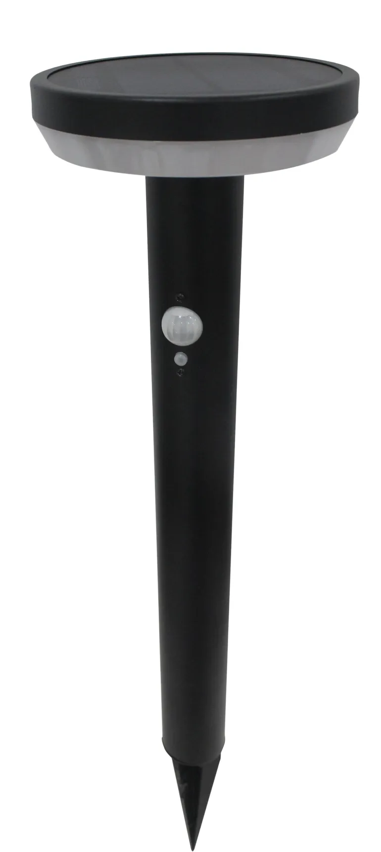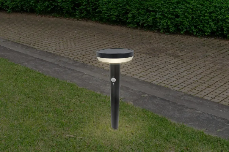 Aurinkokennolla toimiva puutarhavalaisin, joka on varustettu liiketunnistimella. Materiaaleina ruostumaton teräs ja opalisoitu muovi.