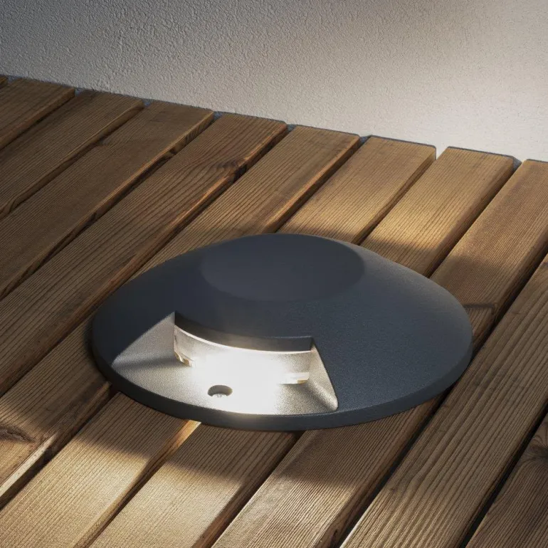 Suuri ja vankka antrasiittiharmaa maavalaisin terassille. Maavalaisimmen halkaisija on 20 cm ja korkeus 4,2 cm. 10 W:n sisäänrakennettu LED. Maavalaisimessa on IP65-luokitus.
