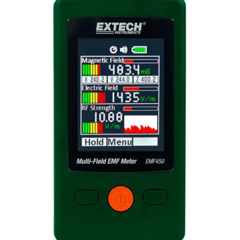 Extech EMF450 on 3-in-1 magneettikentän voimakkuusmittari, joka mittaa ja osoittaa magneettikenttiä, sähkökenttiä ja radiotaajuuksia. Mittarissa on ergonominen muotoilu ja 240×320 pikselin TFT-näyttö.