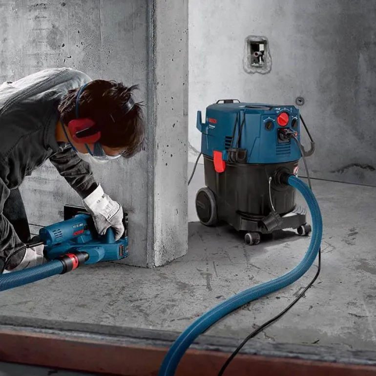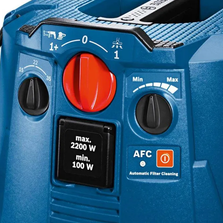 Bosch GAS 35 H AFC on huipputehokas märkä-/kuivaimuri, joka takaa entistä paremman käyttöturvallisuuden. Sen turvasuodatin kerää 99,995 % terveyttä vaarantavista pölyistä. Hyväksyntä H-luokan pölyn imurointiin parantaa entisestään käyttöturvallisuutta, koska se suojaa syöpää ja muita sairauksia aiheuttavalta, orgaanisten materiaalien (esim. homeitiöt) sekä säiliöiden valmistusmateriaalien (esim. lasikuitu) pölyltä. Sen suodattimen automaattisen puhdistusmekanismin ansiosta vältyt turhilta työn keskeytyksiltä. Virtauksen valvontatoiminto tarkkailee imurin jatkuvaa ilmavirtausta ja varoittaa äänimerkillä, jos ilmavirtaus on liian alhainen. Kaikki Click & Clean -järjestelmällä varustetut Bosch-sähkötyökalut voi yhdistää suoraan GAS 35 H AFC Professional -imuriin ilman adapteria. Erittäin suorituskykyinen 1 380 W:n imuturbiini, jonka 254 mbaarin (millibaarin) imuteho takaa tehokkaan pölynpoiston. Märkä-/kuivaimuri on varustettu antistaattisilla ominaisuuksilla staattisen sähkön varautumisen vähentämiseksi.