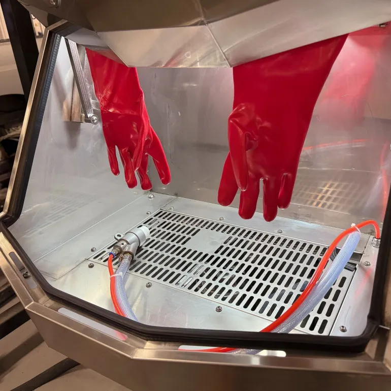 Kun seos osuu työkappaleeseen, se valuu takaisin säiliöön ja kiertää järjestelmässä uudelleen. Märkäpuhalluskaappi puhdistaa virtauksen avulla kitkan sijaan, mikä takaa hellävaraisen viimeistelyn, jossa vesi toimii voiteluaineena. Tämä estää puhallusmateriaalin tunkeutumisen työkappaleen pintaan ja pidentää sen käyttöikää.