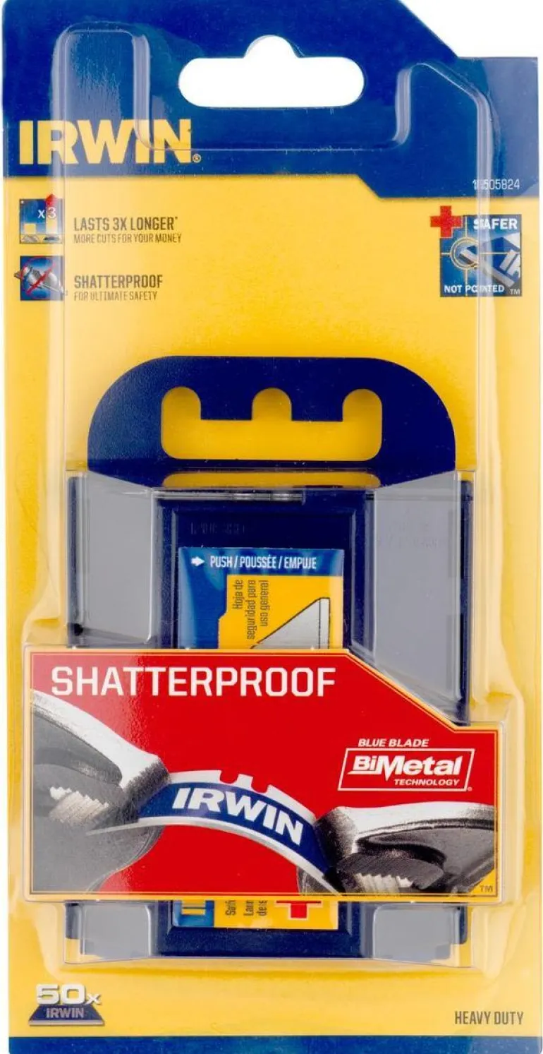 Irwin 10505824 on 50 kappaleen pakkaus yleiskäyttöisiä mattoveitsenteriä bimetallista. Bimetalli muodostetaan hitsaamalla pikateräsreuna jousiteräkseen, joka antaa materiaalille kestävyyttä ja pidemmän käyttöiän.