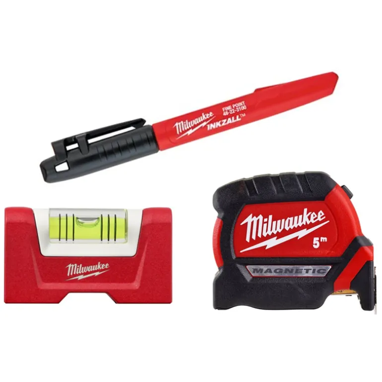 Yhteispakkaus, joka sisältää INKZALL-merkkiaineen, kompaktin Torpedo-vesivaa’an ja 5 metrin pituisen mittanauhan, jossa on magneetti.