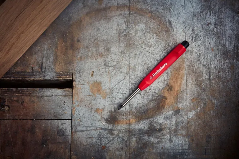 Merkkauskynä sisäänrakennetulla teroittimella selkeiden merkintöjen tekemiseksi. Kynässä on kotelo, jonka muoto varmistaa, että kynä pysyy paikallaan myös kumartuessasi.