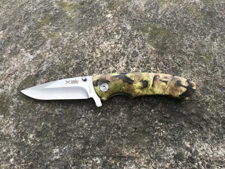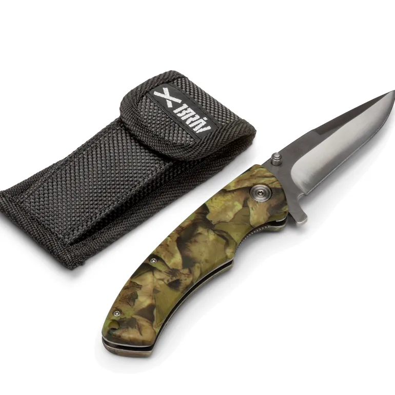 Metsästysveitsi, varsi synteettistä materiaalia. Ruostumaton terä 420-terästä, satiinipintainen. Kahva synteettistä materiaalia, vihreä camo-kuvio.