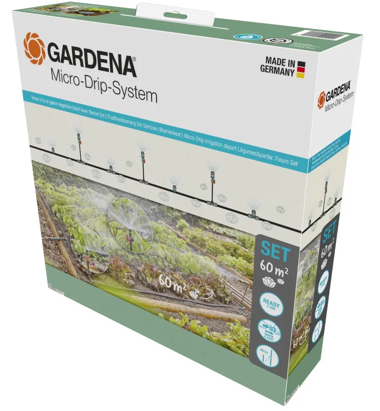 GARDENAn Micro-Drip-kastelusarja istutusalueille on ihanteellinen jopa 60 m²:n istutusalueiden luotettavaan ja tehokkaaseen kasteluun. Heti käyttövalmis sarja on erittäin helppo asentaa. Korotusputkien avulla on mahdollista nostaa suihkusuutin korkeammalle kasvien kasvaessa, ja kastella hienolla suihkulla niiden yläpuolelta. Suihkun kantamaa on helppo säätää säätöventtiilillä. Patentoidun Quick & Easy -liitäntätekniikan ansiosta sarjan komponentit voidaan irrottaa ja koota uudelleen milloin tahansa niitä vahingoittamatta, mikä on kestävän kehityksen mukaista.