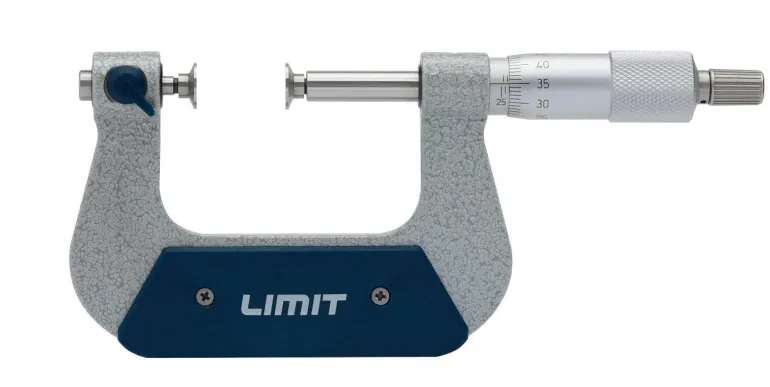 Mikrometri, jossa on taottu sanka ja mattakromattu asteikko sekä vaihdettavat mittakärjet. Karkaistussa 6.5 mm:n ruuvissa kovametalliset, hienohierretyt mittauspinnat. Kitkaruuvi ja lukitusvipu. Mukana 6 paria mittakärkiä. Valmistettu DIN 863 -standardin mukaisesti.