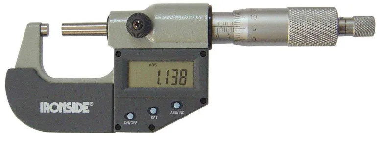 Digitaalinen kaarimikrometri, mittauspinnat kovametallipinnoitetut, hiotut ja hienohierretyt. Mittausalue 0 – 25 mm. Erottelutarkuus: 0,001 mm . Tarkkuus normin DIN 863 mukaan. Mattakromattu mittarumpu ja holkki. Kotelointiluokka IP 54. Automaattinen sammutus. Toimii yhdelä SR44-paristolla. Mukana vankka kotelo ja paristo.