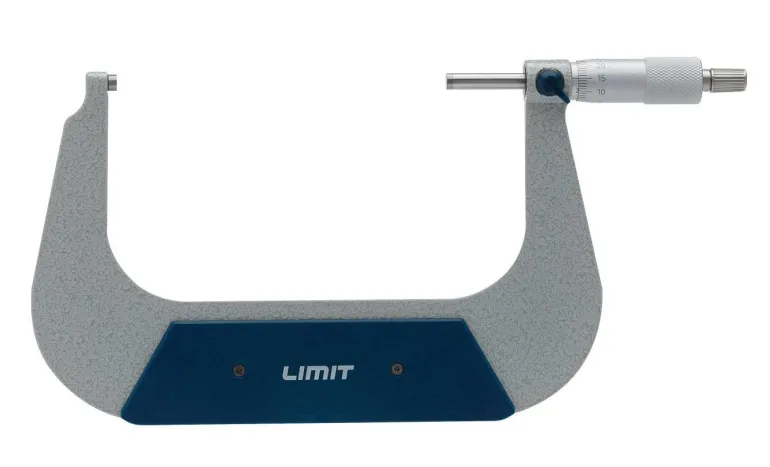 Mikrometri, jossa on maalattu terässanka ja mattakromattu asteikko. Karkaistussa 6.5 mm:n ruuvissa kovametalliset, hienohierretyt mittauspinnat. Kitkaruuvi ja lukitusvipu. Valmistettu DIN 863 -standardin mukaisesti.