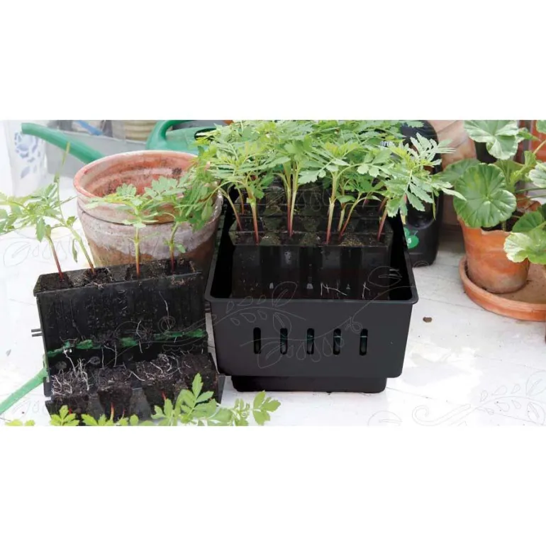 Rootmaster on kompaktin kokoinen minikasvihuone, jossa on viljelyä helpottava itsekastelutoiminto: lisää vettä laatikkoon tarvittaessa ja anna taimien kukoistaa! Kun juuret kasvavat ulos kennojen ilmastointiaukoista, niiden päät kuivuvat ja uusia juuria muodostuu ylemmäs. Tämän Ilmatypistyksen avulla kasvi luo vahvan ja hyvin kehittyneen juuriston. Taimien käsittely on helppoa, sillä kennoston solut aukeavat kirjan tavoin. Musta pohjalaatikko on valmistettu kierrätysmateriaalista. Laatikko ja kansi ovat polypropeenia (PP) ja kennostot ovat polystyreeniä (PS). Kaikki osat ovat korkealaatuisia. Pakkaus sisältää myös 8 kappaletta kastelunauhoja, jotka voidaan pestä ja käyttää uudelleen.