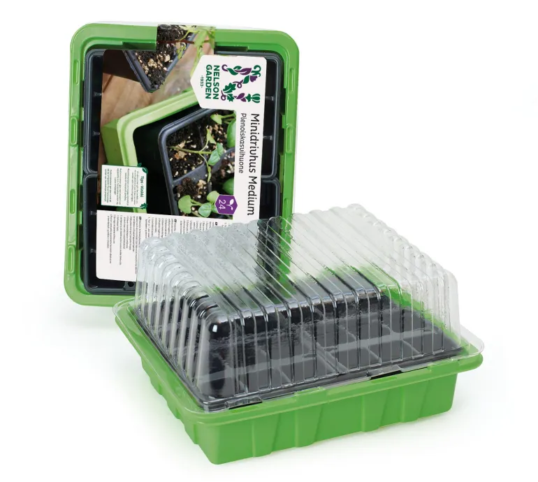 Helposti sijoitettava minikasvihuone sisältää 4 ruukkusarjaa, joissa on 6 kennoa. Pakkaukseen voi kylvää eri lajikkeiden siemeniä ja koulia eri kasveja tarpeen mukaan. Näin pienoiskasvihuoneen eri osiin saadaan tilaa uudelle kylvölle. Syvät kennolevyt antavat taimille parhaat mahdolliset kasvuolosuhteet vahvan ja hienon juuriston kehittymiselle. Pohjassa oleviin syvennyksiin sopii myös 20 turvebrikettiä.