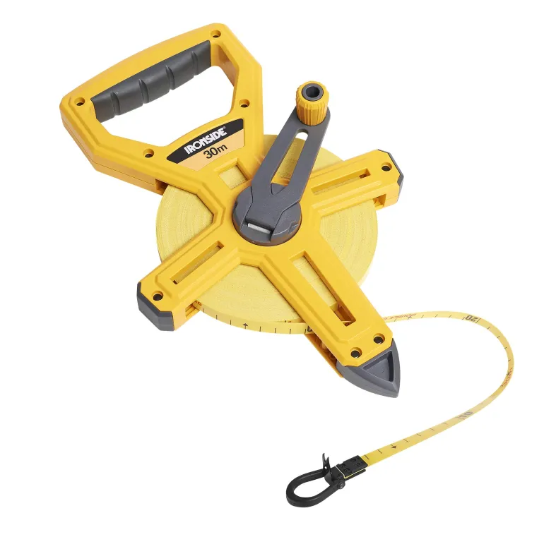Lasikuitumittanauha valkoisella millimetriasteikolla ja keltaisella senttimetriasteikolla. Metallirengas ja taittuva päätyhakanen.