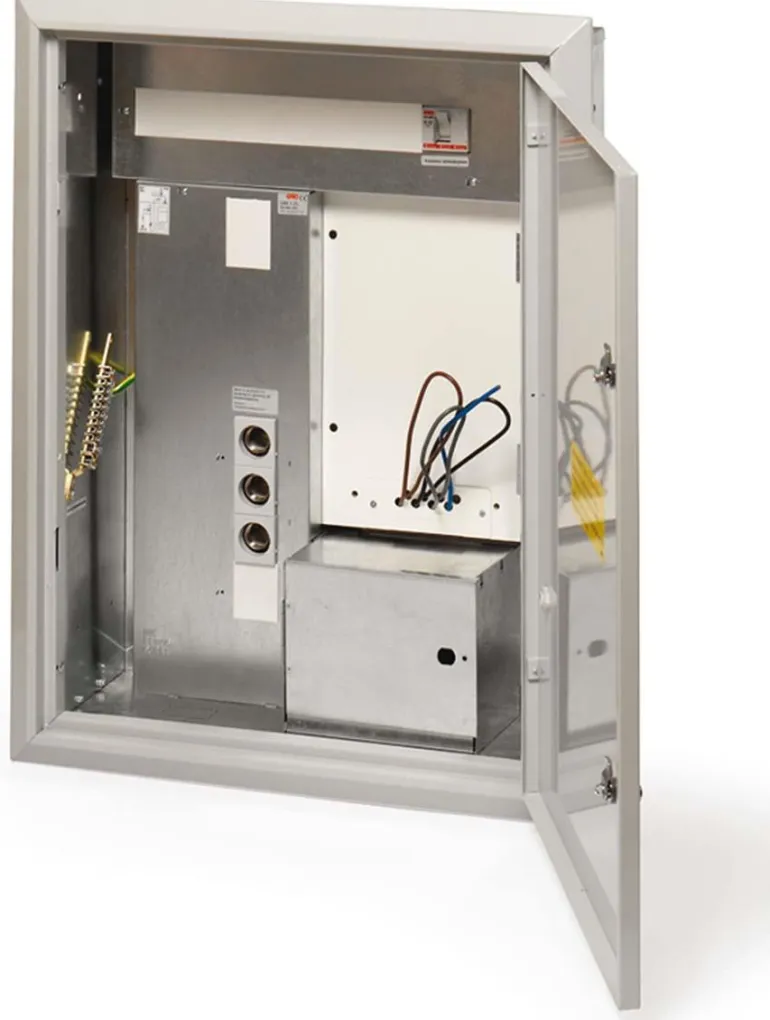 Mittarikaappi metallilevyä, uppoasennukseen. Potentiaalin tasauskisko (tyyppi PUS) toimitetaan vakiona PE-paneeliin kytkettynä kaikissa uppoasennettavissa kaapeissa.