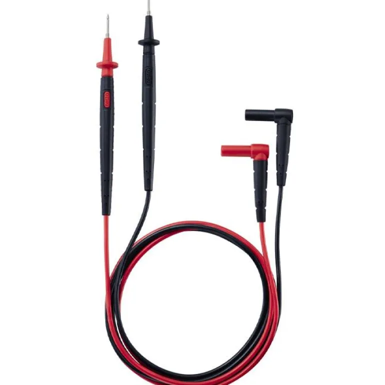 Mittakaapelit, joissa on 2 mm leveä ja 18 mm pitkä kärki ja kulmaliitin. Sopii Teston hauenleukaliittimiin 05900009, voidaan liittää sekä Teston että muiden merkkien tehopihteihin tai digitaalisiin yleismittareihin. 2 kpl.