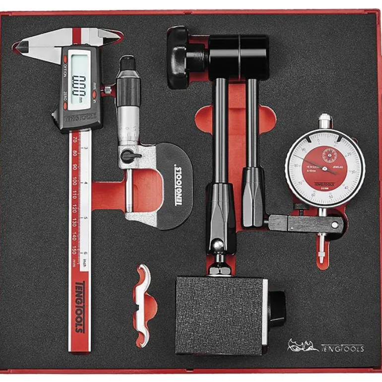 Teng Tools 270190101 on 3-osainen mittaussarja. Sisältää digitaalisen työntömitan 150 mm, mikrometrin 0–25 mm ja jalustan, jossa on mittakello DGMM. Toimitetaan irrotettavalla kannella varustetussa muovilaatikossa.