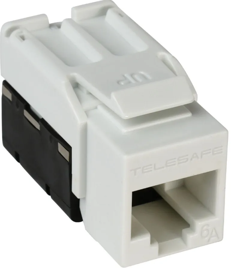 Modulaarinen liitin TCS QuickConnect UTP C6. Johtimet kytketään aukkoihin, QuickConnect-työkalua käytetään painamaan johtimet teriin.
