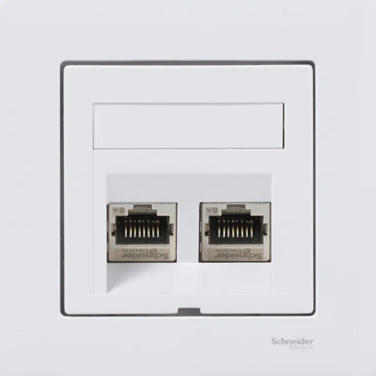 Datapistorasia Exxact Kat 6A STP suorassa tai kulmamallissa, kehyksellä tai ilman. Liitäntäsarja sisältää 2 Kat 6A STP S-One modulaarisen jakkiliittimen, 1 levytukikehyksen kojerasiaan c/c 60 mm, 1 valkoisen litteän/suoran keskilevyn pölyluukuilla tai 1 valkoisen kulmaimallisen keskilevyn.