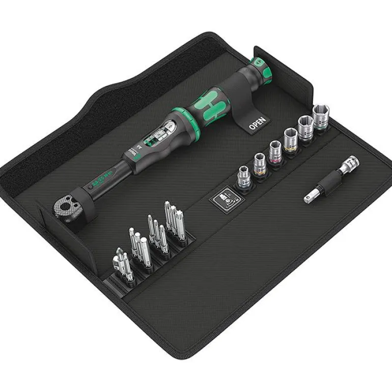 Wera Click Torque A6 set 1 on momenttiavain sekä tarvikkeet ja laukku. Momenttiavaimen arvo on helppo säätää kuuluvan ja tuntuvan naksahduspalautteen ansiosta, ja tämä helpottaa halutun vääntömomentin tallentamista. Kun haluttu vääntömomentti saavutetaan, kuuluu selvä naksahdus. Vääntöavaimessa on hienohampainen askelsäätö, jossa on 8 asteen paluukulma (45 hammasta) ja räikkämekanismi. Mukana kompakti ja kestävä tekstiilikotelo.