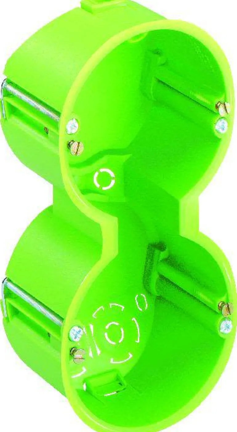 Monitoimirasia, jossa on kaapeln läpivienti kulmassa putkien ja kaapeleiden liiallisen taipumisen välttämiseksi. Kaksoismonitoimirasia mahdollistaa lävistyksen vain rasiajyrsimellä. Reikien välejä ei tarvitse sahata, joten säästät ylimääräistä työtä. Kaksoisrasian alareunassa on merkintä, joka merkitsee helposti seinään, minne kaksi reikää jyrsitään.